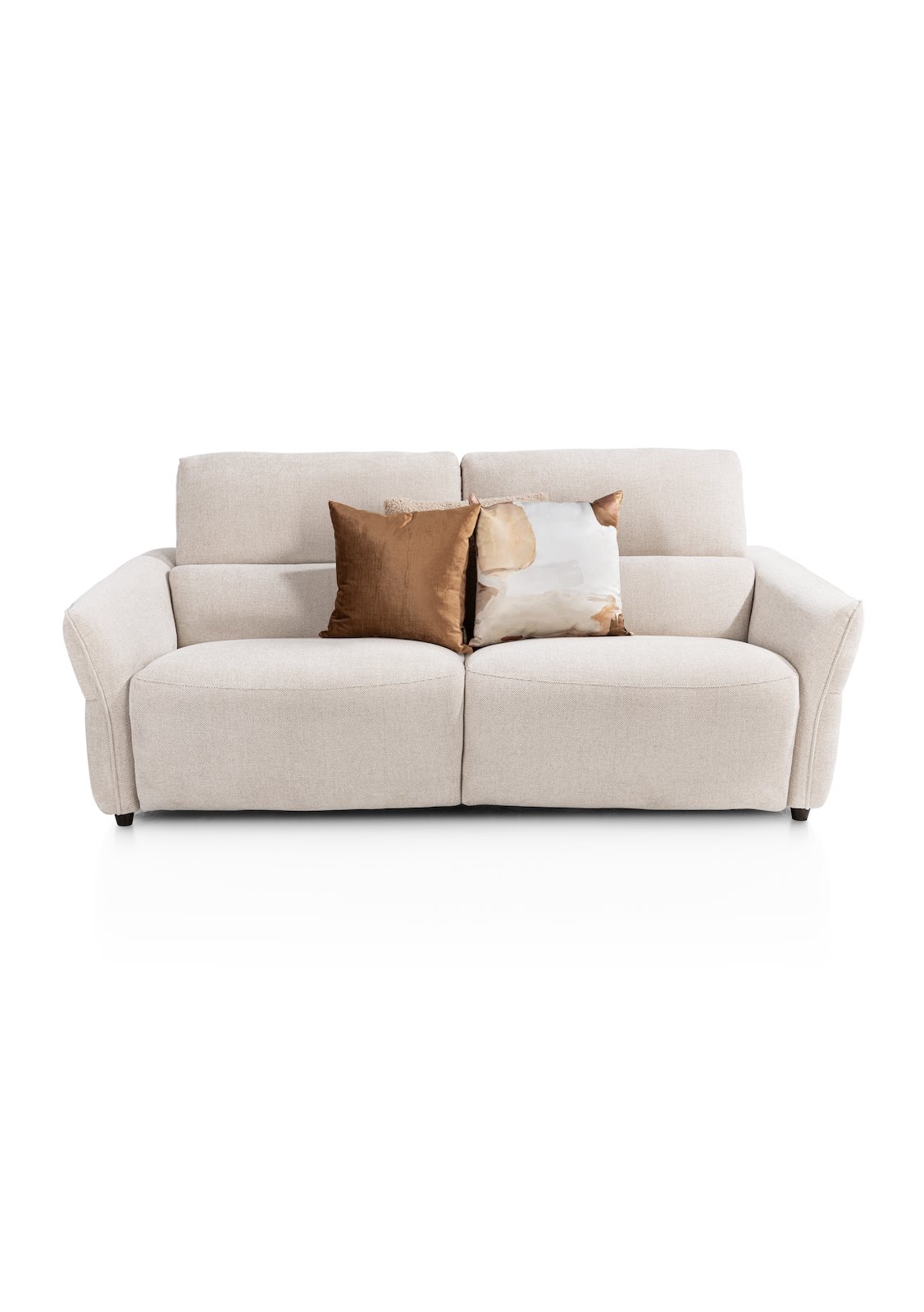 De 3-zitsbank met twee armen biedt twee royale zitplaatsen en is bekleed met de hoogwaardige stof Vada in de kleur beige. Deze neutrale tint past moeiteloos in elk interieur, van modern tot landelijk, en laat zich prachtig combineren met natuurlijke materialen en zachte aardetinten.