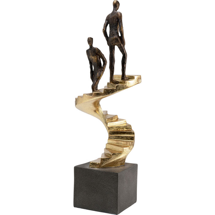 Breng een stijlvolle en artistieke touch in huis met Beeld Stairway Two. Dit expressieve decorobject toont twee gestileerde figuren die samen een glanzend gouden spiraaltrap beklimmen.