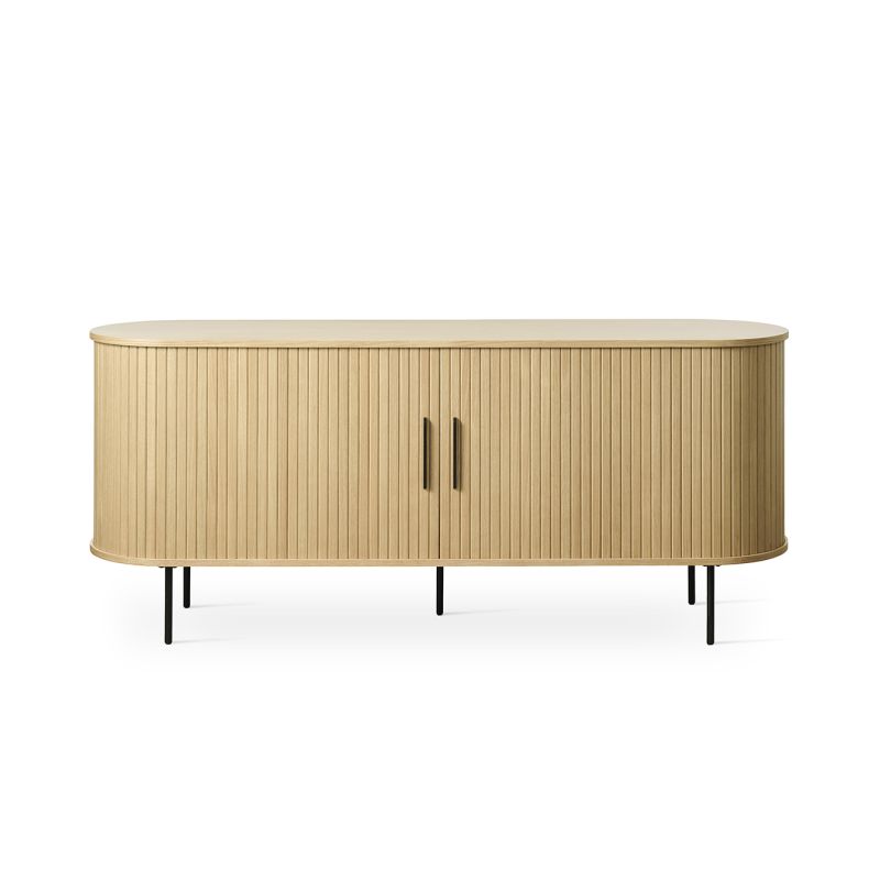 Het dressoir is uitgevoerd in naturel, maar ook verkrijgbaar in smoked oak en zwart, zodat je altijd een variant vindt die perfect aansluit bij jouw woonstijl. Het onderstel in zwart metaal zorgt daarbij voor een stoere en eigentijdse touch.