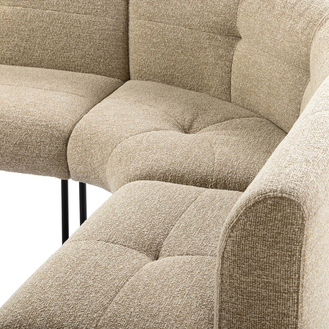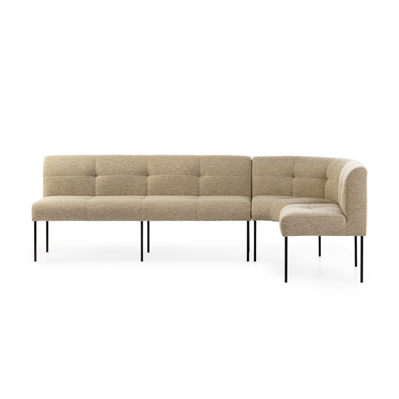 Het slanke onderstel van zwart metaal maakt de bank luchtig en eigentijds, waardoor hij perfect past in verschillende woonstijlen.