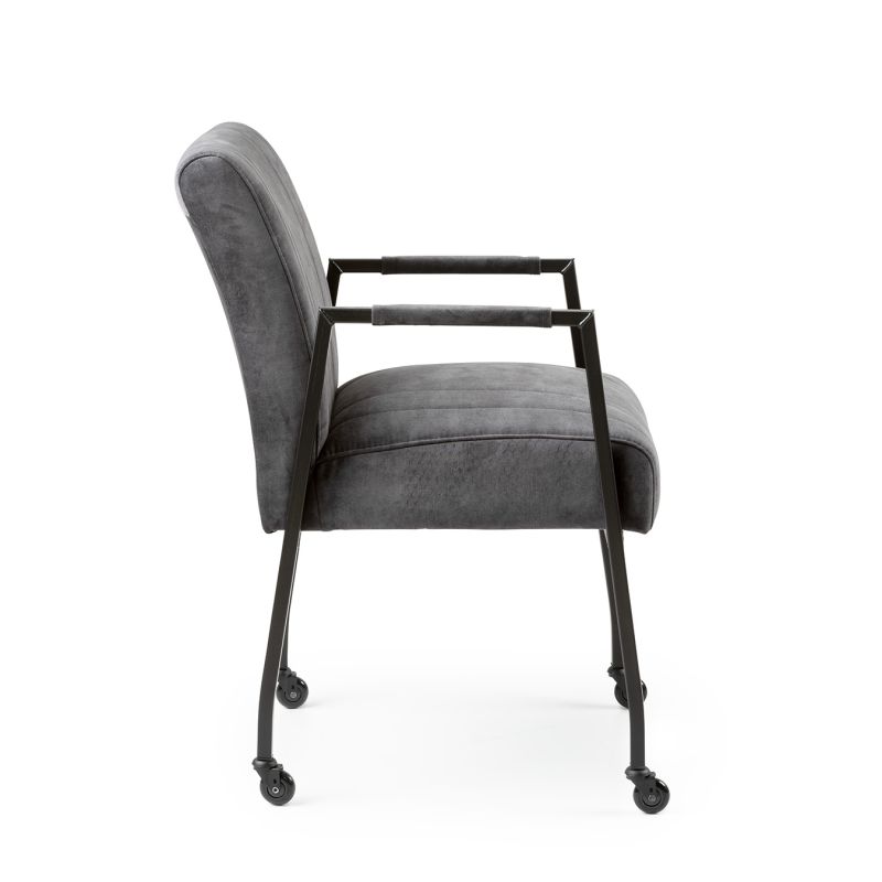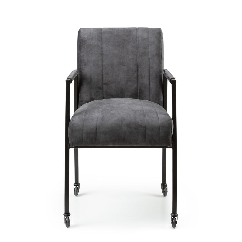 Goed om te weten: bij een bestelling via onze webshop wordt de Floor armstoel geleverd in stof Adore, kleur antraciet, met zwart metalen onderstel en skatewielen, zoals getoond op de afbeeldingen.