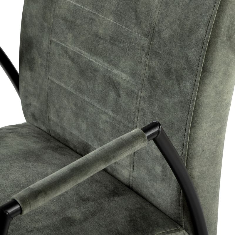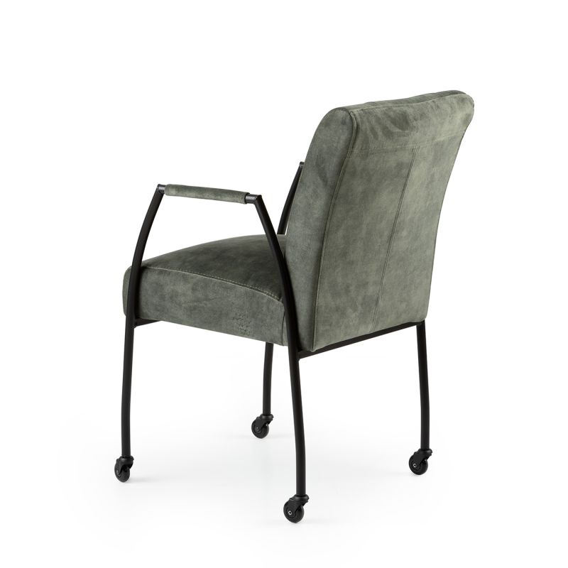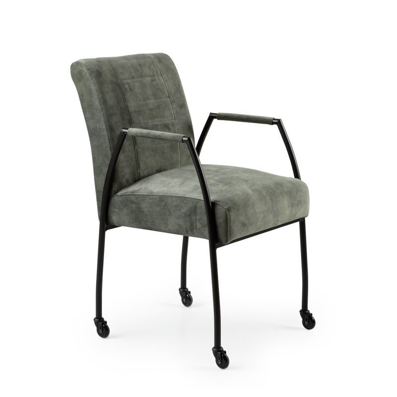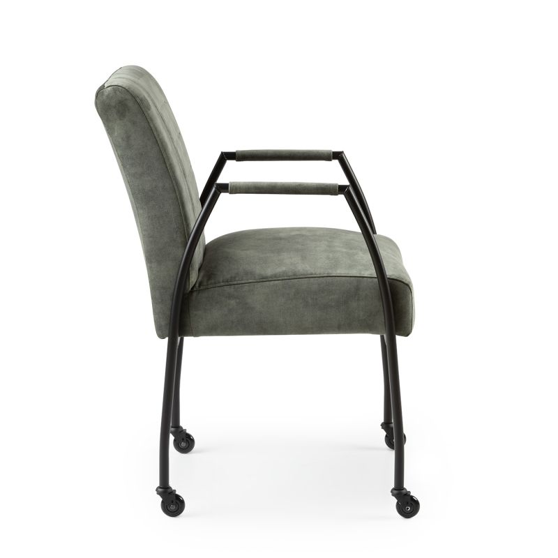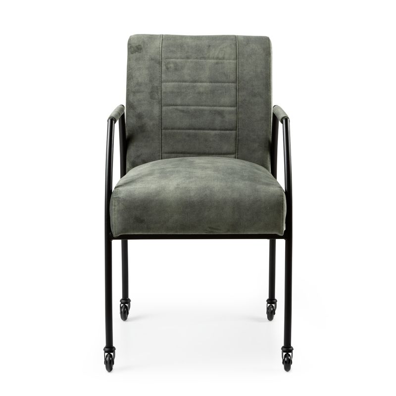 Goed om te weten: bij een bestelling via onze webshop wordt de Floor armstoel geleverd in stof Adore, kleur hunter, met zwart metalen onderstel en skatewielen, zoals getoond op de afbeeldingen.