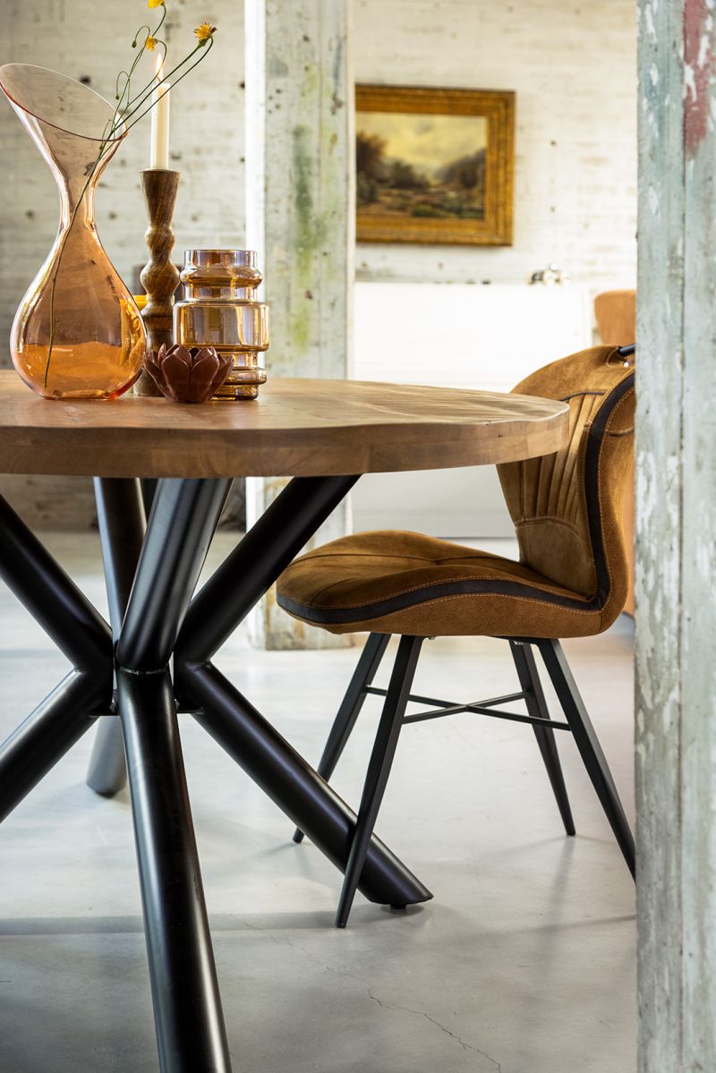 De Splash eetkamerstoel is een echte blikvanger aan je eettafel. Bekleed met hoogwaardige Luxor-stof in de kleur cognac, straalt deze stoel pure elegantie uit.