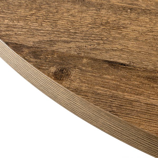 Zoals afgebeeld is de tafel uitgevoerd in lamulux in de warme kleur mokka, met een stijlvol rond tafelblad en een robuust metalen onderstel in de kleur zwart.