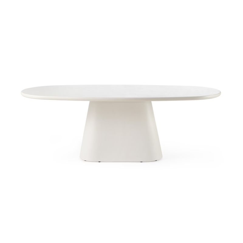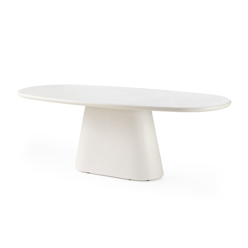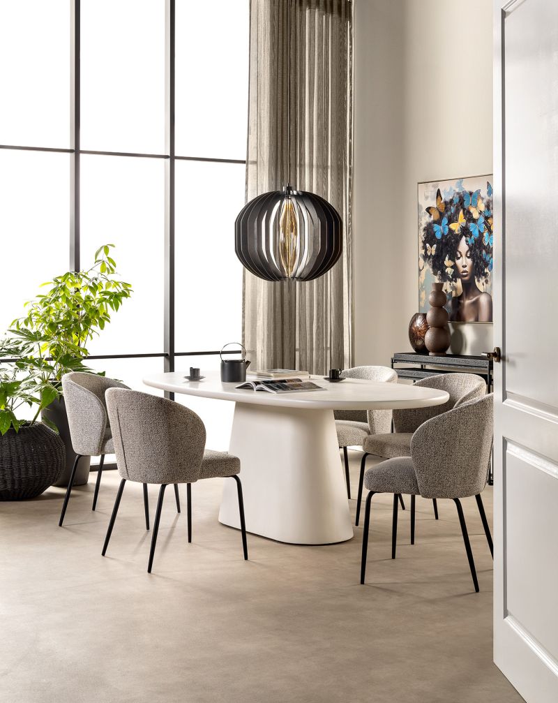 Ontdek de unieke Narvik eettafel ovaal van 220 cm, een opvallend meubelstuk dat perfect past in een modern interieur. De Narvik eettafel is gemaakt van hoogwaardig MDF en cement, afgewerkt in een stijlvolle witte kleur. Deze combinatie van materialen zorgt voor een strakke, eigentijdse uitstraling die elke eetruimte onmiddellijk naar een hoger niveau tilt.Wat de Narvik eettafel echt bijzonder maakt, is de massieve tafelpoot in het midden. Dit unieke ontwerpdetail zorgt niet alleen voor stabiliteit en duurzaamheid, maar geeft de tafel ook een moderne en sculpturale uitstraling.Met zijn ovale vorm en royale afmetingen van 220 cm biedt de Narvik eettafel voldoende ruimte voor gezellige diners en uitgebreide feestmaaltijden. Of je nu een moderne eetkamer wilt inrichten of een minimalistisch design zoekt, de Narvik eettafel is de perfecte keuze. Voeg deze unieke tafel toe aan je interieur en geniet van de perfecte combinatie van stijl, functionaliteit en modern design.