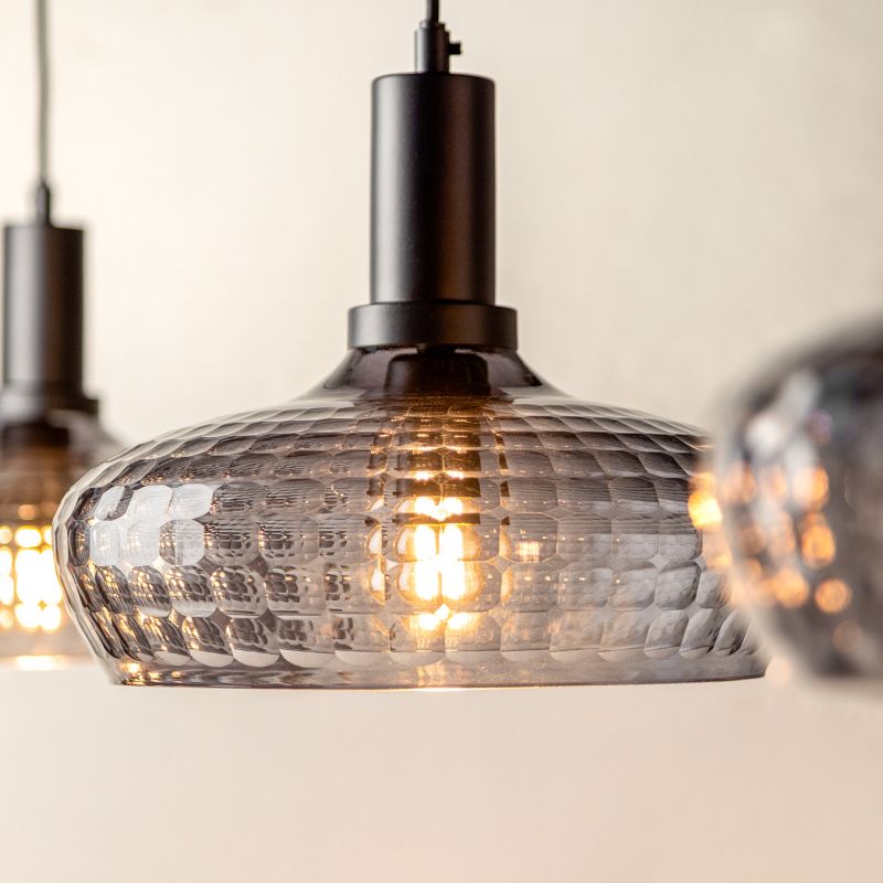 De drie glazen lampenkappen verspreiden een subtiel, warm licht dat een uitnodigende ambiance creëert.