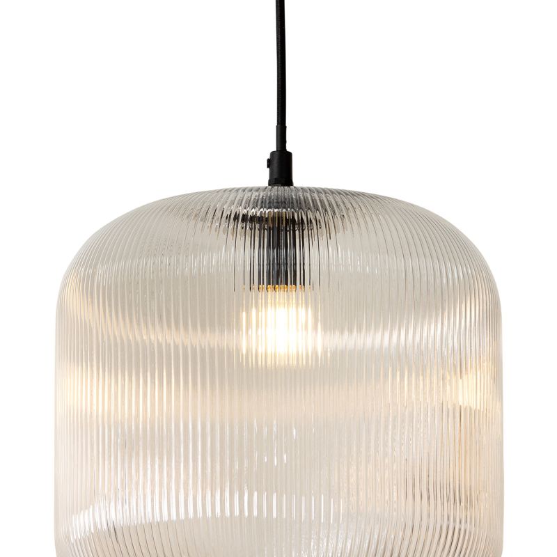 De Ethon hanglamp 3-lichts is een stijlvolle toevoeging aan je interieur en combineert een strak metalen frame met elegante geribde glazen kappen.