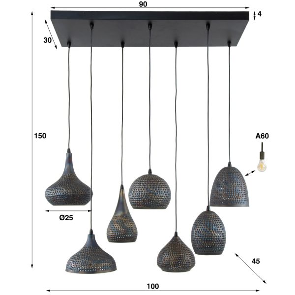 – Afmetingen: breedte 100 cm, diepte 45 cm, hoogte max. 150 cm – Kapdiameter: Ø 25 cm – Materiaal: metaal met kunststof snoer, bronzen binnenzijde – Bediening: via wandschakelaar – Lichtbron: (niet inbegrepen) gebruik 7x LED lichtbron E27 – Onderhoud: eenvoudig af te nemen met een lichtvochtige doek