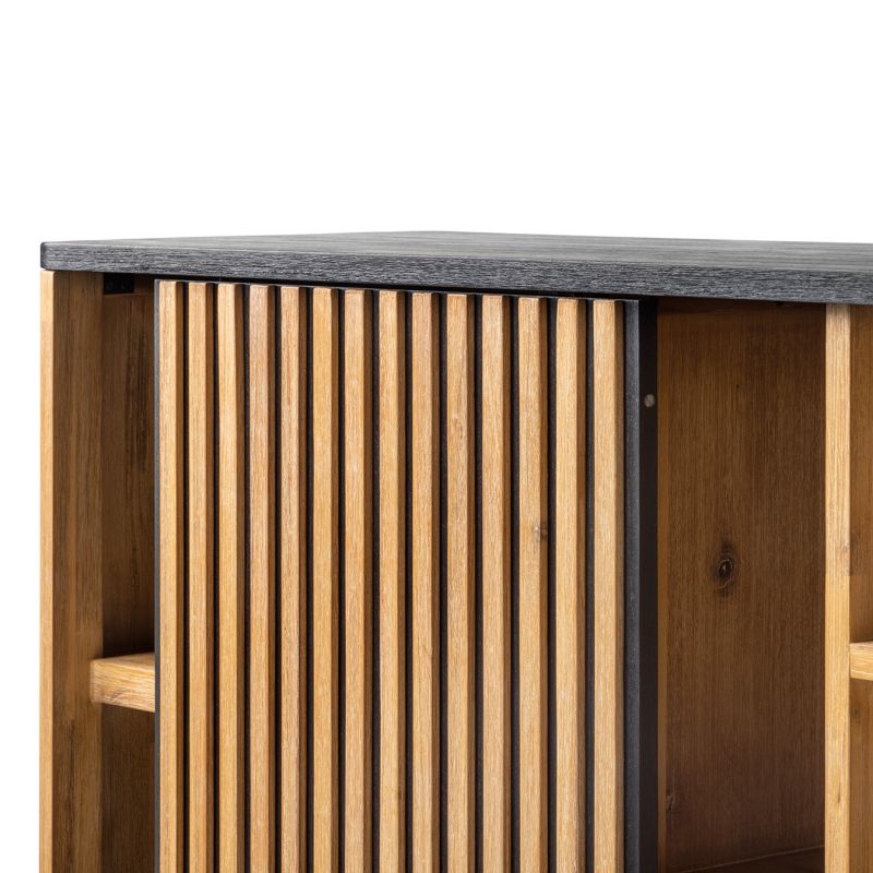Een opvallend detail zijn de verticale latjes op de schuifdeur. Deze zorgen voor textuur en diepte en creëren een stijlvol contrast tussen het warme karamelkleurige hout en de zwarte accenten. Het geheel staat op een zwart stalen onderstel, wat het highboard een robuuste en industriële uitstraling geeft.