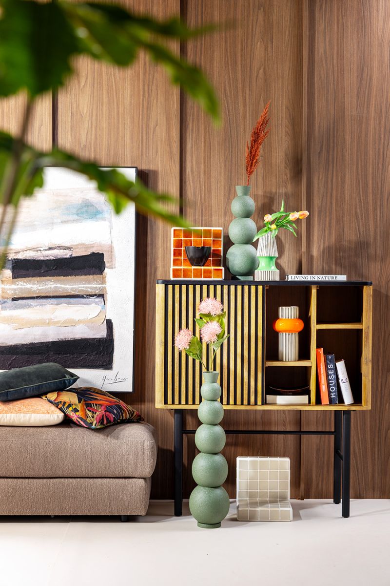 Het meubel is voorzien van 1 schuifdeur en 4 open vakjes. Hierdoor kun je decoratieve items mooi in het zicht plaatsen, terwijl je andere spullen netjes achter de schuifdeur kunt opbergen. Zo combineert het highboard praktisch gebruik met een stijlvol design.