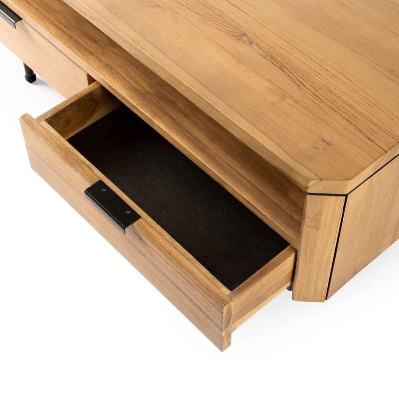 De open ruimte onder het blad maakt de tafel luchtig en functioneel – ideaal om je favoriete boeken of afstandsbediening bij de hand te houden. De twee lades bieden extra opbergruimte, zodat je woonkamer altijd netjes en stijlvol oogt.