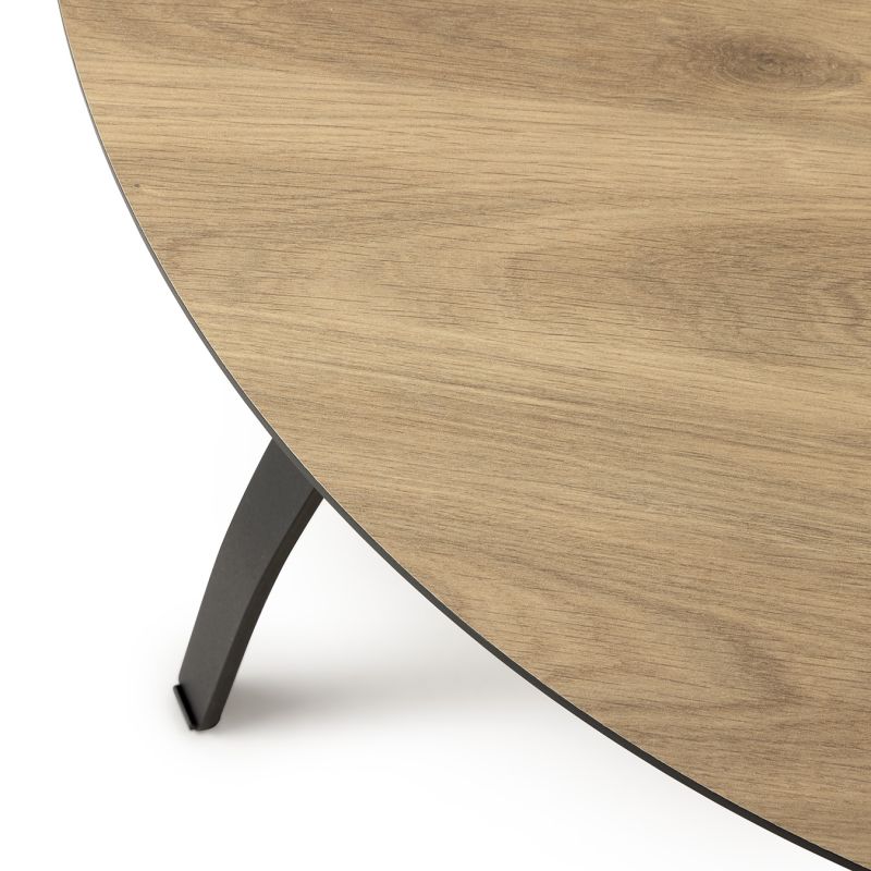Zoals afgebeeld zie je de Zylon uitgevoerd als ronde salontafel van 90 x 90 x 37 cm met een HPL blad in de kleur Honey en een zwart metalen frame. De warme houtlook van het blad geeft sfeer, terwijl het zwarte onderstel zorgt voor een krachtig en modern contrast. Compact van formaat, groots in uitstraling.