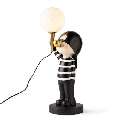 Het speelse design met het vrolijke figuurtje dat een gouden “kauwgombel” blaast, maakt van deze lamp meer dan alleen een lichtbron – het is een kunstwerk met een knipoog.